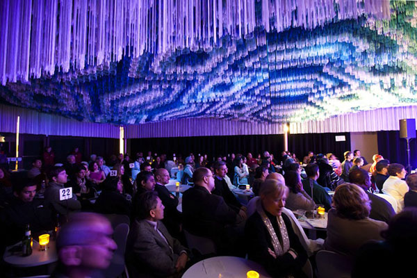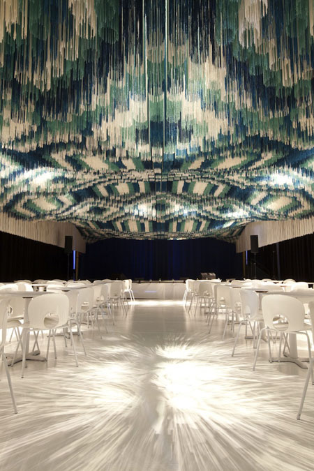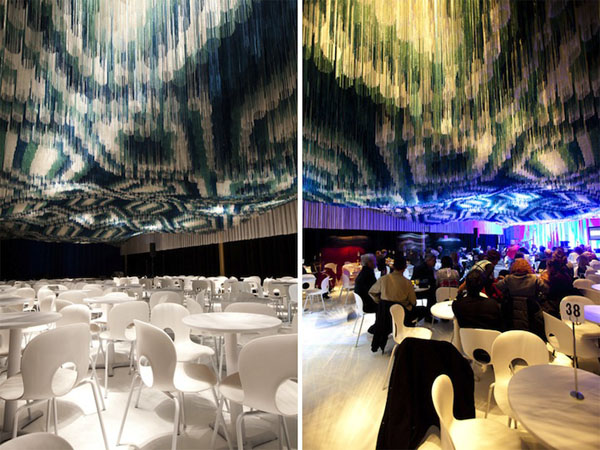 光是看到這張照片,就讓我感覺好頭皮發麻啊!如果是你敢坐在這個俱樂部裡頭嗎?其實這是倫敦建築工作室Serie Architects,幫美國華盛頓DC甘乃迪中心的多用途會館「Monsoon Club」所設計的3D視感天花板,是用懸空的繩子所組成,共有白、綠、藍等四種顏色,形成自然的3D視感,坐在其中彷彿天花板是立體波紋,相當獨特的設計。