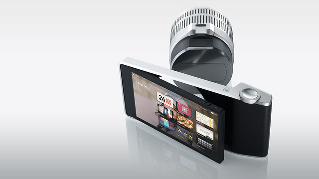 Camera Futura 除了有手 機該有的一切功能,像是打電話傳簡訊上網,拍照上傳Facebook也是現今的基本需求。這上圖為手機與鏡頭分開後的模樣,光看圖片大家也許會認為相機整 體很重。不過不用擔心,Camera Futura 的設計是將光學透鏡、圖像感應器和圖像處理引擎都融入一個鏡頭成像組件中,所以機身內並沒有裝備圖像感應器,使得Camera Futura 機身其實是很輕巧的。