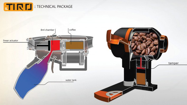 「il Tiro」在西班牙文中是手槍的意思,不過「il Tiro」裡頭裝的不是子彈,而是水和咖啡豆,只要把水加到「槍把」,磨好的咖啡豆放到「子彈夾」中,設定好溫度,時間一到,輕輕扣上扳機,就能喝到一杯又濃又純的Espresso,「子彈」上膛後可以泡三杯咖啡,看來也十分適合重度咖啡上癮者喔!