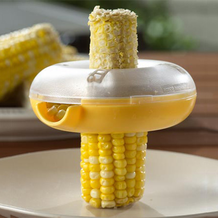 這個玉米切割器看起來很像甜甜圈,中間有一圈切割刀,只要套住玉米往下直嚕,就可以享受到甜蜜圓潤的玉米粒,比用刀子切還來的省事!不管是追求優雅的淑女或者懶得自己動手的少女都適用,實在應該將它做成手機吊飾天天帶在身邊的阿!(誤)