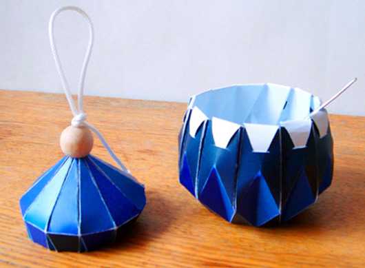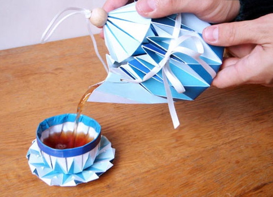 日本工業設計師Yuya Ushida十分擅長以常見的生活小物設計出令人驚艷的作品,像是之前讓人看了屁股很癢的筷子沙發,就是他的設計,而今天介紹的這組摺紙茶具組,以銅板紙作為材質,瓶身的摺痕從上往下看,就像是一朵朵綻放中的藍色小花,壺蓋上繫上棉繩與木球,剛好可以用來綁緊壺口,避免茶水濺出。