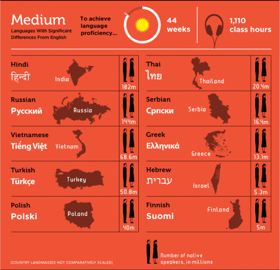 中等區(44周,1,100小時可達到精通程度):北印度語、俄文、越南話、土耳其語、波蘭話、泰文、塞爾維亞語、希臘語、希伯來語、芬蘭語。
