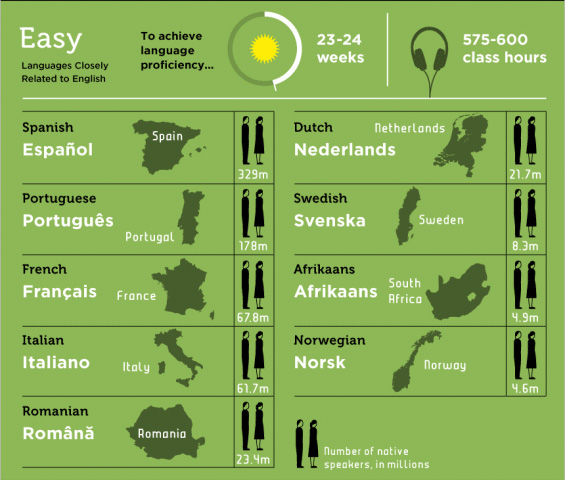 簡單區(23-24周,575-600小時可達到精通程度):西班牙文、葡萄牙文、法文、義大利文、羅馬尼亞語、荷蘭語、瑞典語、南非荷蘭語、挪威語。