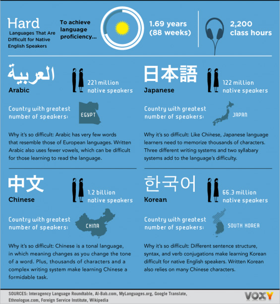 除了大人物之前介紹過的「世界上最難學的4種語言」以外,下面的圖像以各種因素分析出了這些以英文為母語的外國朋友所認為最簡單、中等,以及最難學的語言。中文很不意外的被列進了最難學的語言之一,要達到精通程度必須花上超過一年半的時間……嗯,我們英文可是學了12年還是無法精通啊(翻桌)!