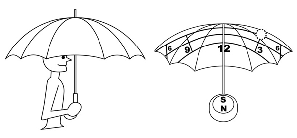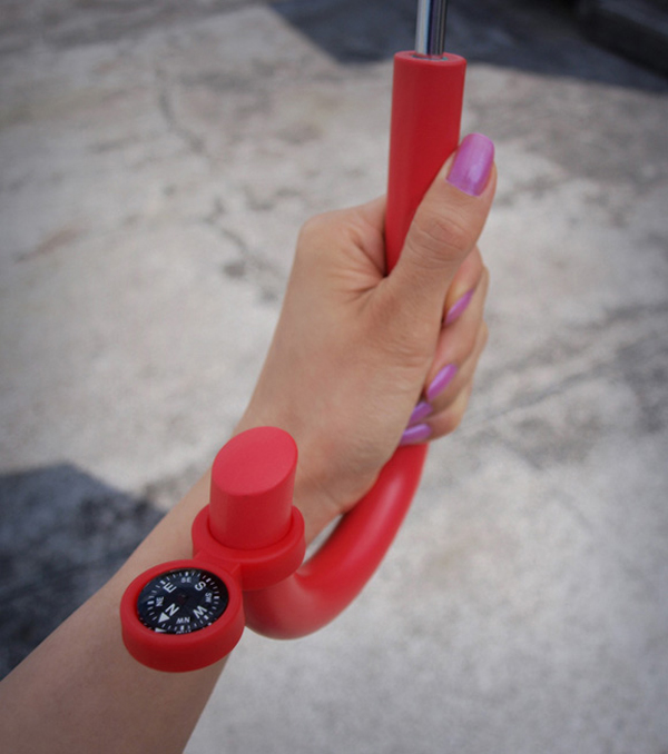 這把看起來跟一般雨傘沒兩樣的「報時洋傘(clock-parasol)」,是由日本「snug design」設計工作室的根津孝太(Kota Nezu)所設計,結合了讓你隨時知道自己方位的 心海 羅盤、利用日晏原理得知時間的傘面,當你面向北邊時,傘面上的時間就能告訴你時間,讓雨傘不再只是雨傘一種功能,當然最重要的還有,它是把不折不扣的洋傘,可以有效隔絕97%的紫外線,讓你白拋拋幼咪咪的肌膚不會晒黑,真是一把聰明又貼心的晴雨兩傘啊!