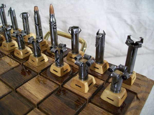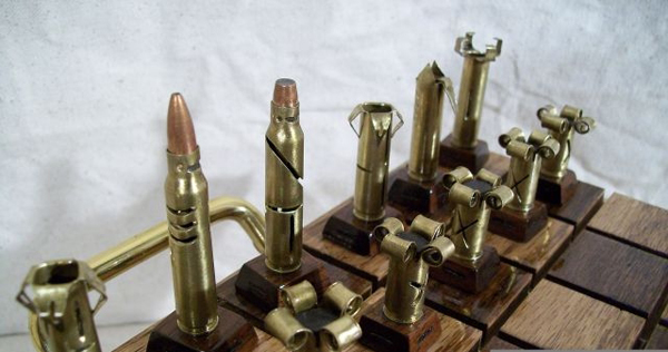 自從電動玩具、掌上型遊樂器、電腦遊戲、甚至是手機遊戲盛行以後,傳統的棋類似乎便漸漸沒落,好像現在下棋時不配一杯老人茶就不行。但儘管如此,這年頭對棋類癡迷的人還是不少。用手拾起帶著一點重量的棋子再緩緩放下,直到聽見棋子和棋盤相撞所發出的「叩」的聲音恐怕還是要實體棋具才有辦法做到。一家生產過各種風格的西洋棋的公司Old World Collectibles and Creations這次用了一樣非常獨特的元素製作他們的西洋棋,那就是:「子彈」!