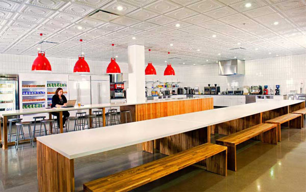 Town Hall位於總部核心,明亮寬敞的空間,足以容納各個部門的員工,來這邊交誼、用餐、休閒、玩樂,用色明亮的用餐區及撞球間,不僅照亮了整個空間,也照亮了員工的心。