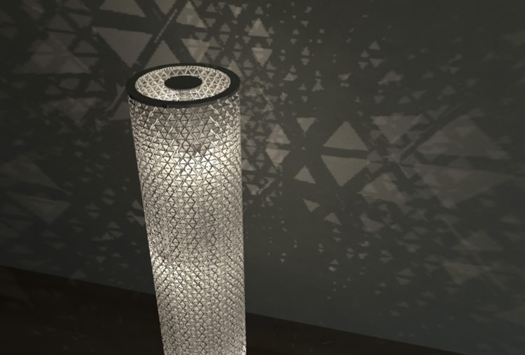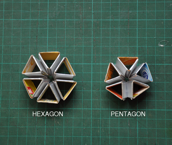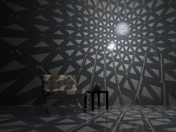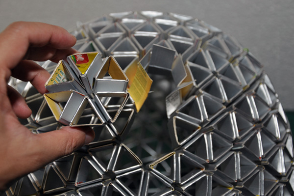 燈燈燈燈~這個燈罩的確是由利樂包回收製作,它利用利樂包飲料內層鋁箔反光的特性,剪裁製作成賣相很好的燈罩,從遠處看去根本就是個高級傢俱。更厲害的是,拆開的利樂包經過結構設計之後,只需要折成五邊形和六邊形,就能組合出圓形燈罩而不需要任何接合劑(大人物的腦沒有組合的很好想不通怎麼辦到),而投射出來的光線還隱約在牆上印出幾何圖形。