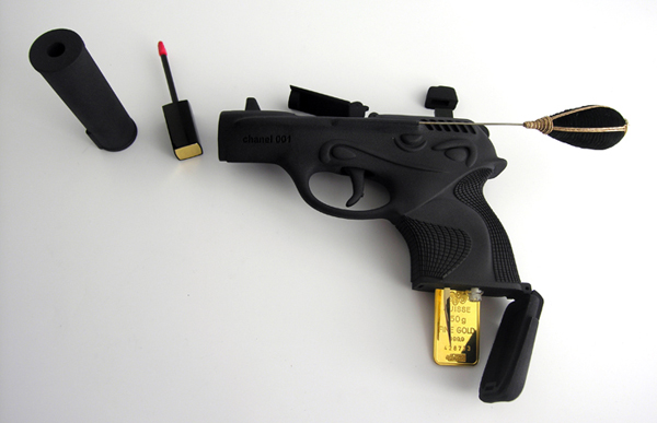 為了向化妝界眾家大師致敬,珠寶設計師Ted Noten以手槍為造型,創作出Seven Necessities系列,以白色的「Dior 001」和黑色的「Chanel 001」為首,每支手槍內都暗藏著幫助女人贏得兩性戰爭的秘密武器,包括槍口中的唇蜜、槍膛中的維他命(或威而剛)、彈匣中的金條(這......?)、牙籤、髮簪、香水等等,準心還躲著4GB的USB,把男人迷得暈頭轉向時,可以趁機偷走他的機密檔案(這就是傳說中的人財兩失嗎?),非常適合立志當007界的美女間諜使用啊!