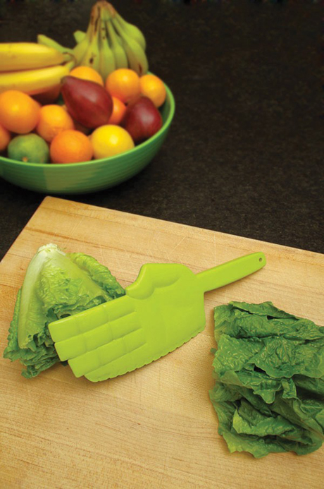 哈~沒錯,這個巨大的手刀正是讓你可以在廚房練習空手道的好法寶!(誤)其實這是個切生菜沙拉的生菜刀,塑膠材質輕鬆上手不易傷手,只需要用對力道,生菜們馬上 碎屍萬段 乾淨俐落分兩半,而且如果一次拿兩把手刀再搭配食神雞姐的忘我神情,我只能說,這廚房裡保證沒有人敢惹你啊XD~