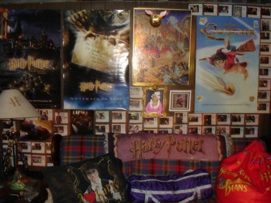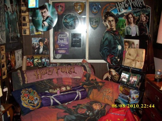 在他身上還可以找到霍格華茲的徽章、天狼星在阿茲卡班監獄的監獄號碼、J.K.Rowling的簽名等刺青,就連他的髮型、髮色,也都按照新書或新電影中他最喜歡的英雄剪染燙,十幾年下來,光是紀念品就花了他大約美金13,000元(將近台幣38萬元),走進他的房間,就像從現實世界走入魔法王國一樣,四處充滿奇幻色彩。