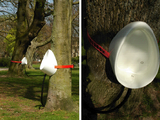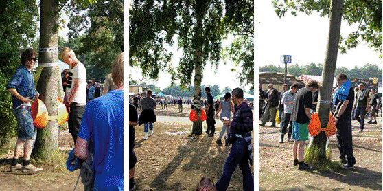 這是在丹麥的一個活動會場旁,他們在兩個地方放置了五十座橘色的P-TREE,比起一座一座因為密閉而發臭的傳統臨時廁所,這個方法不但環保,又可以幫樹施肥,根本就是一箭多雕啊,你看超過一千多個人使用就知道有多少雕受歡迎了。