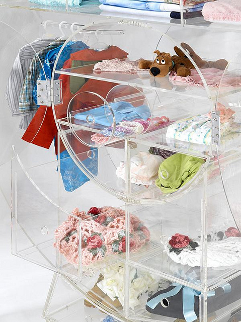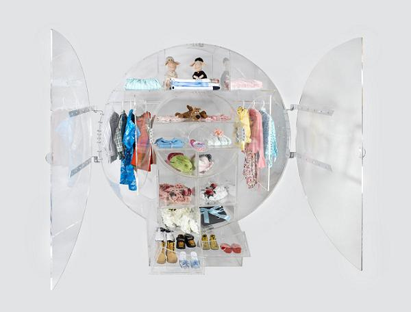 以色列設計工作室打造的這一款透明衣櫥,專門為了兒童打造,高度大小十分適合矮身高的小朋友。而且圓圓造型就像是摩天輪一樣,十分具有童趣喔!衣櫥的開啟也十分簡單,中間兩扇大門打開。外套長形衣物掛兩側,中間的空間可以規劃放置衣服,而下方放置褲子或裙子。最下面拉出的抽屜則是置放鞋子的地方。利用位置來提醒小朋友衣物該放哪裡,十分方便的設計。
