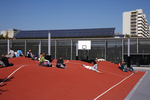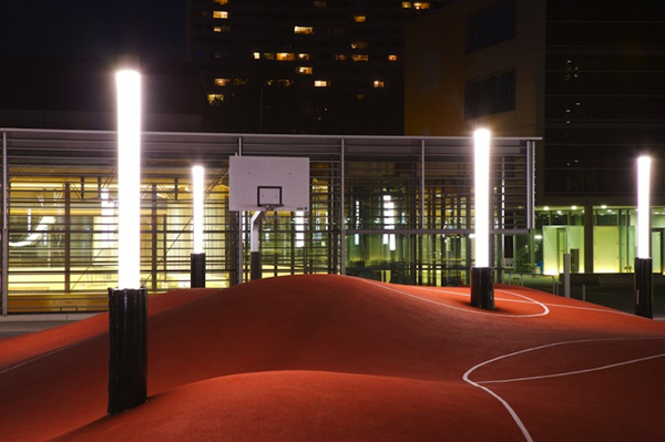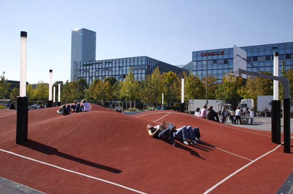 這是由德國藝術團體Inges Idee所設計的一個如沙漠一般高低起伏的籃球場。球場本身的大小與一般球場無異,但有著3D曲面的地面卻連一顆球都無法好好放置。這個籃球場包含了兩個籃球框、柔軟的橘紅色地面,和許多條狀造型的街燈。地面的起伏是經由電腦3D軟體演算得來。如果你正納悶這樣的球場可以用來做什麼,那不妨參考圖片裡的人的做法,躺下來悠哉的曬個太陽吧!