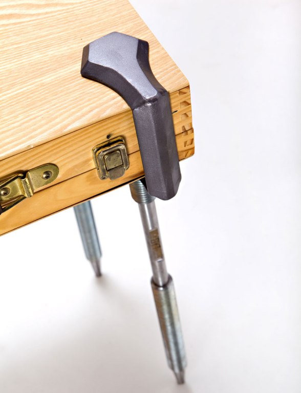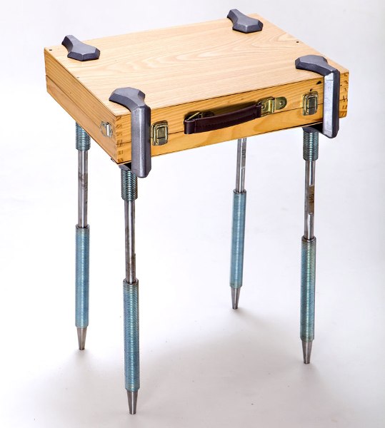 呼~扯了好久終於轉回來了,這個設計是正在以色列就讀設計學院的學生yael zwickel所完成的,名為「Make a Table」,他的設計概念就是希望可以在任何需要桌子的場合,就可以利用手邊既用的書本、板子、鍋碗瓢盆柴米油鹽醬醋茶當桌面,再簡單調整螺絲,迅速組成一張桌子。