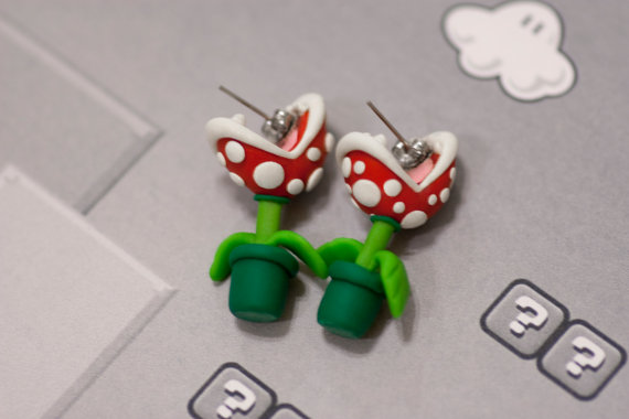 設計師 Elizabeth Kohn 利用軟陶 (polymer clay) 手工製作瑪莉歐系列飾品,軟陶的外觀溫潤樸實,讓遊戲裡殺氣騰騰的食人花瞬間變成可愛的小耳環,看它巴在耳垂上的樣子,很有小跟屁蟲的感覺咧!