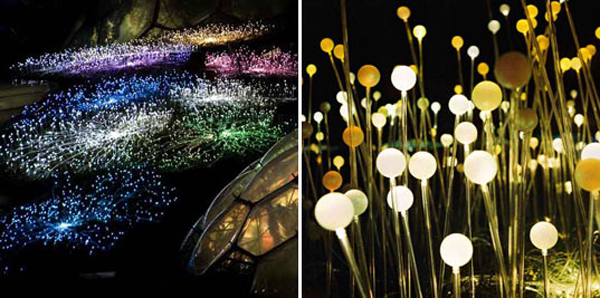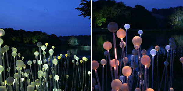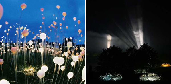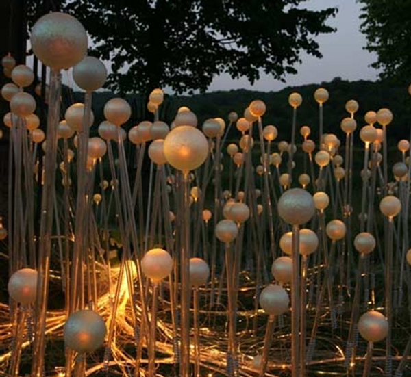 Bruce Munro的作品向來走的是大膽的光雕秀路線,結合包括光纖燈或LED燈在內的各式燈光,創造出令人目不暇給的視覺魔幻效果,像是他在2009年在教育中心Eden Project中所展出的Field of Light,沿著草原斜坡佈滿六千個壓克力燈,罩著玻璃燈罩,每當太陽西下,草原上的燈泡一盞盞亮起,遠遠望去,就好像是夜空中的星星光芒反射在地上一樣,讓人離不開視線,又有點像正在向異星球發送訊息的外太空生物,每一個顏色、每一個燈光寫下最神秘的訊息,等待咱們去破解。