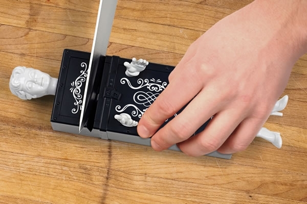 這款可愛又kuso的磨刀器,利用了把人切兩半的魔術梗,將黑色磨刀器上面加上了手腳跟四肢,猛然一看就像是魔術道具般,只要將你的菜刀放上去,就連劉謙大師也要甘拜下風,因為你再怎樣砍、怎樣磨都不會玩出人命啊!只會讓你的菜刀越磨越亮,拿來當做洩憤用的療癒系商品,剛剛好。