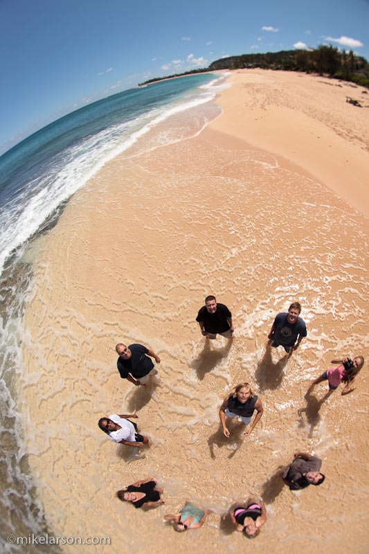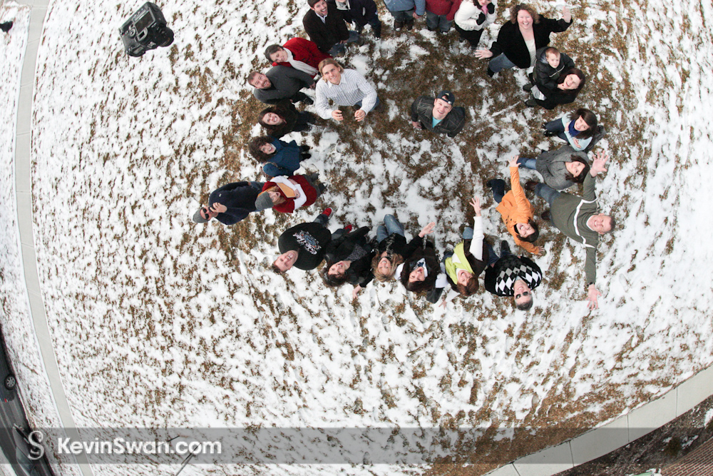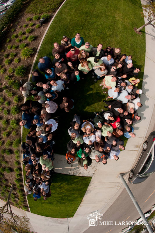 這是國外一名攝影師 Mike Larson 的瘋狂主意,事先開啟相機的倒數自拍功能後,就將機器往天空拋起來拍攝團體照,廣角鏡頭配上在空中的距離,就可以將大家統統都拍進相片裡,這邊除了要大讚攝影師的大膽創新之外,這樣的拍攝手法其實有不少好處: