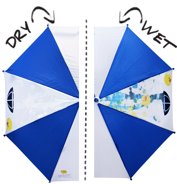 由來自英國的一家年輕卻充滿創意的公司SquidLondon販售的折疊式黑白雨傘可以輕巧的收納到你的包包裡,不過摺疊傘滿街都是,該如何突破一般人對雨傘既有的刻板印象呢?這款傘面上用hydrochromatic 墨水繪製黑白圖案在遇水後會化成彩色圖案,因此只要開始下雨,雨水便會一滴一滴將雨傘染色,最終將上面的黑白圖案變成色彩繽紛的樣貌,而在傘乾了後又自動恢復原狀。在下雨天時你不只能享受觀看著你雨傘上神奇的化學變化,還能讓你成為群眾中的焦點。