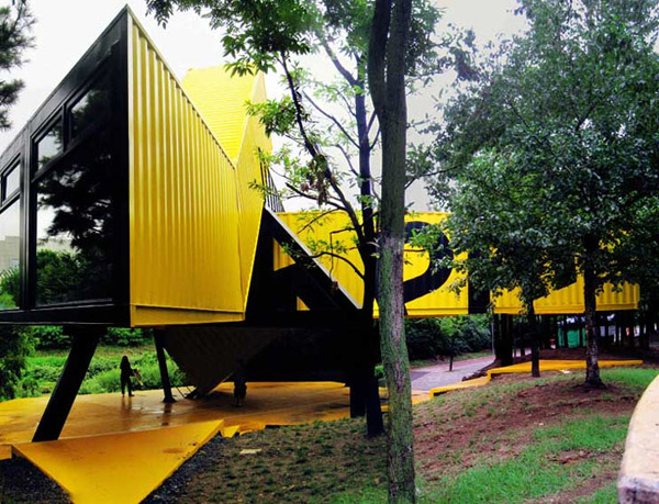 走近韓國的APAP Open Schhol一看,絕對立刻被這間搶眼的黃色貨櫃學校鎖住視線,設計團隊LOT-EK特別將八個貨櫃斜架高離地三公尺,擺橫放串連在一起,成了風格活潑的設計學校,別以為一個貨櫃空間不大,要知道團結就是力量,八個串在一起就足以容納兩間工作室、一間大型會議室和一個畫廊,其他公共區域還可以當成劇場等公開表演舞台,讓學生盡情揮灑創作才華。