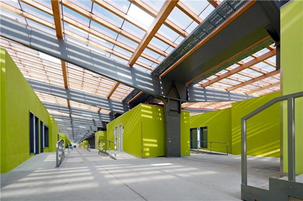 乍看之下,一般人應該很難想像德國Herwig Blankertz Vocational School的前身,居然是世界第二次大戰時的兵工廠,經過改裝後,保留原本的建築結構,屋頂改為半透明的太陽能面板和玻璃,陽光灑入室內的同時,還能同時產生再生能源,擺入組合式的教室,便成了節能環保的學習環境,或許是位於歐洲,才能這麼盡情享受陽光而不怕悶熱或被曬昏,不然在這麼色彩明亮的地方上課,應該不容易打瞌睡才是。