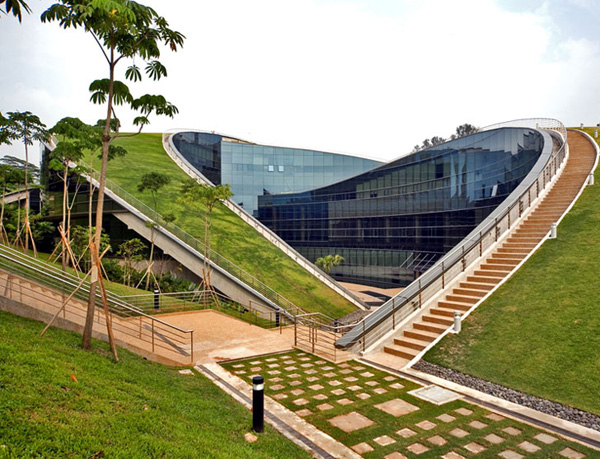 有點懷疑有多少學生來這邊上課,看見新加坡南洋理工大學藝術設計媒體學院上頭那兩道綠色草皮,活生生在太陽下跟大家招手,會忍得住不跑出去玩耍,當初CPG Consultants設計這兩道草皮的目的,是為了讓綠色的草地吸收空氣帶來的水分,達到降溫的效果,順便綠化校園,不過看起來似乎更適合當成在校園沒事蹓躂的好去處。