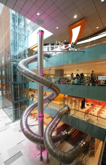 常覺得七早八早機場check in完沒事幹嗎?特別是如果身邊還帶著小孩,漫長的候機時間恐怕會是家長的惡夢,為此,新加坡樟宜機場特別設計了40呎(約12公尺)高的溜滑梯,只要在機場消費美金22元(約台幣六百五),就拿到兩個代幣,以及從溜滑梯溜下來兩次的機會,如果擔心小孩子太小,還不敢玩這麼刺激的溜滑梯,在第三航廈的地下室也有高度稍微低一點(約1.5層樓高)的溜滑梯,供遊客免費遊玩。