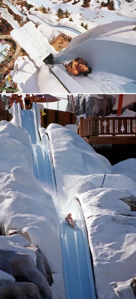在火辣辣的大太陽下,從冰做的溜滑梯上一溜而下,應該挺過癮的,迪士尼Blizzard Beach水上公園或許可以滿足大家的夢想,他們的滑水道雖然不是遠從南極或北極運來的冰山打造而成,不過從120呎高(約36公尺)的仿冰山滑水道衝進清澈的池水,應該能讓人立刻忘記炎熱的夏天。