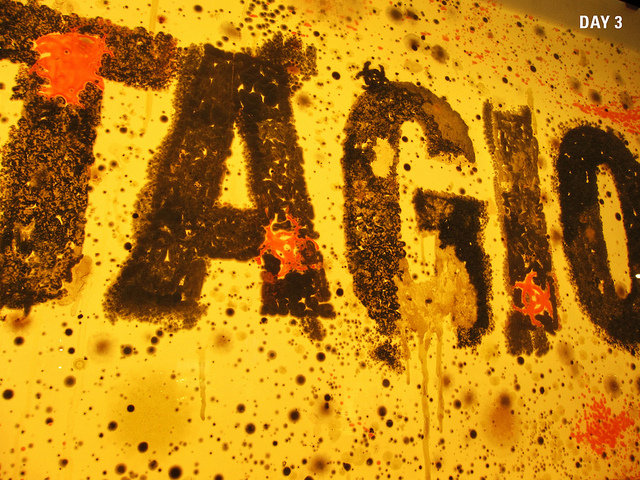 接下來就來欣賞這細菌孳生每天不同的變化,第1天的時候完全看不出有任何的細菌滋生,第2天開始細菌就蔓延了開來,Contagion字跡也能明顯的看出來,到了第3天細菌已經攻佔了所有的廣告看板!而且已經到了嚇人和噁心的地步!