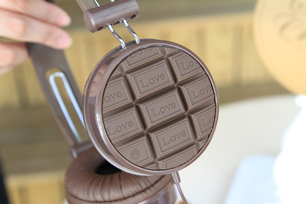 耳機兩側的巧克力外殼,上頭則如同黑巧克力磚一樣,每一格都印有LOVE圖案,戴上了耳機彷彿也戴上了幸福呢!巧克力的左下角則印上了天晴設計的「天字號」Logo。