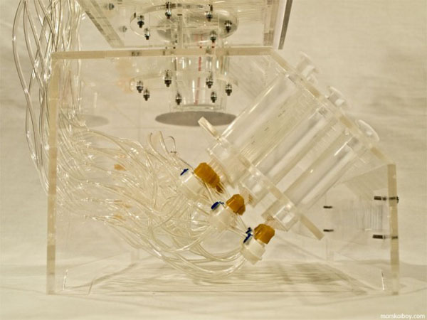 俄羅斯藝術家Morskoiboy日前發明出一台可以透過打字機按鍵自行調酒的「液壓雞尾酒打字機」,利用液壓原理使用者只需要按下打字機按鍵,機器便會按照你的字母指令調出不同顏色的雞尾酒,最終調和成一杯文字雞尾酒,雖然說實驗與噱頭的成本為主,不見得調出來的調酒會有多好喝,但把這些字母變成了一杯杯雞尾酒,真是令人佩服他的無限創意呢!