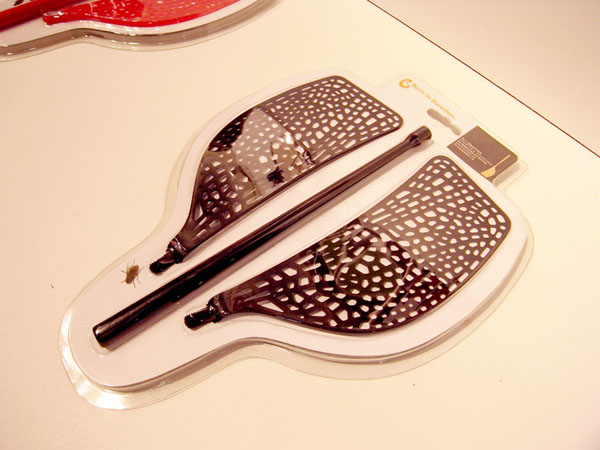 為什麼說它「蒼蠅味」十足呢?因為設計師Pascal Charmolu特別用蒼蠅的翅膀當拍子的造型,平時不用時,兩片「翅膀」可以立起來當裝飾品,當不遠處十點鐘方向出現可疑物體,傢伙抄起來只有得心順手四個字可以形容,由於「翅膀」的孔可以讓空氣流通,揮起來不僅迅速確實,幾乎到達百發百中,拍無虛揮的地步,讓蒼蠅一命歸西時,心中留下「生也蒼蠅,死也『蒼蠅』」的無憾感。