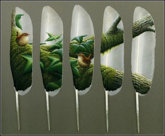為求環保,Davey只使用天鵝自然換毛時掉落的羽毛,經過清洗、拉直後,便能直接在上頭作畫,由於每根羽毛只有1呎長、3吋寬,在動筆之前,Davey也會事先打好草稿,免得稍有閃失。