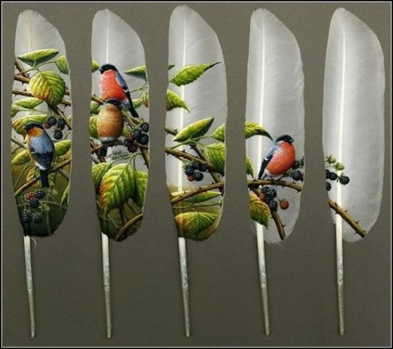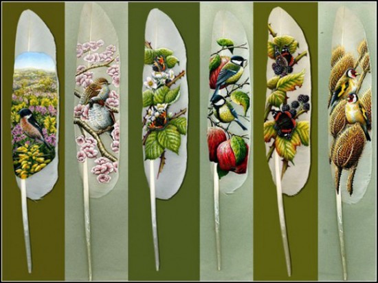 有人喜歡在米粒上頭寫字,自然有人喜歡在羽毛上面作畫,藝術家Ian Davey六年前拿起畫筆時,也沒想過自己會拿羽毛當畫布,但一趟紐西蘭之行,不僅讓他結識未來的妻子Tracey,還讓他見識到羽毛藝術的美麗與感動,他想起了自己在Wales住家附近的Snowdonia National Park,就養了許多天鵝,因而興起了羽毛作畫的念頭。
