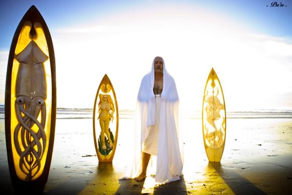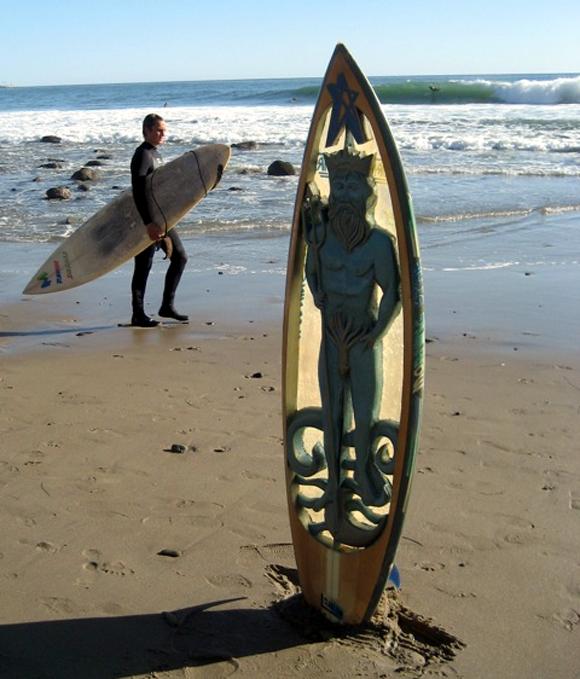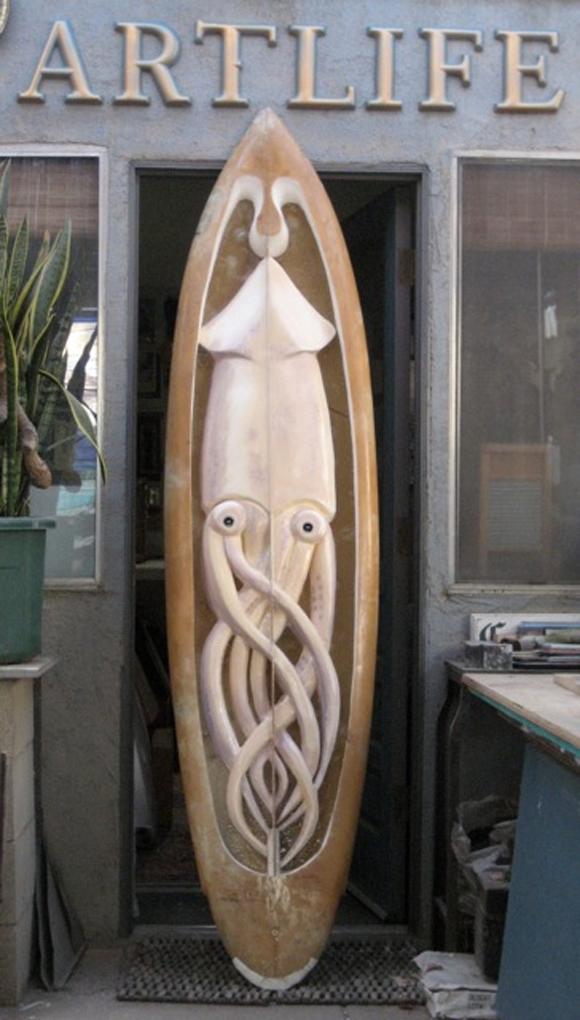 這是藝術家Joe Cardella的衝浪板藝術,這些板子當然不能下水了,但有別於其他藝術家只在衝浪板上作畫,Joe Cardella是把整張板子拿來雕刻,是說很早期剛有衝浪這運動時,板子確實是木頭來的,但現今的衝浪運動,不管是長板或是短板,主要材質都已經是PU泡棉或是Polystyrene了,我是覺得這兩種材質要拿來雕刻是比較方便的。