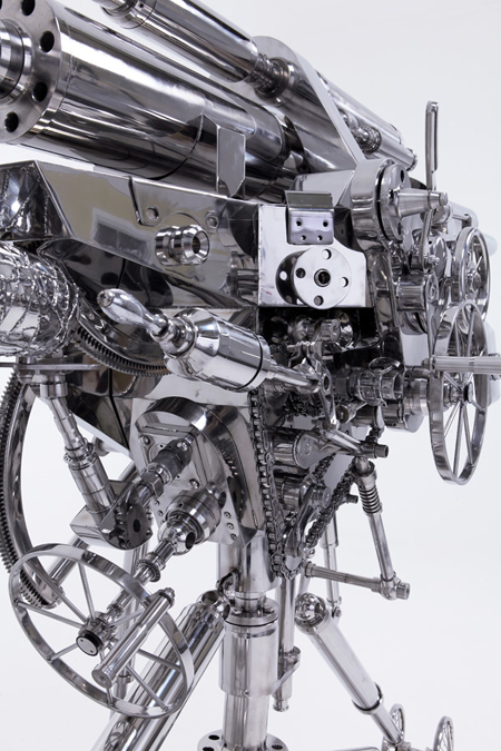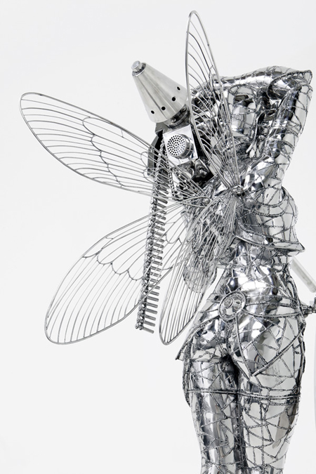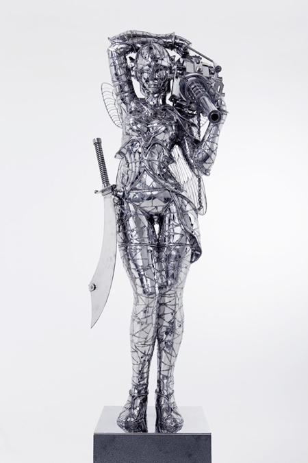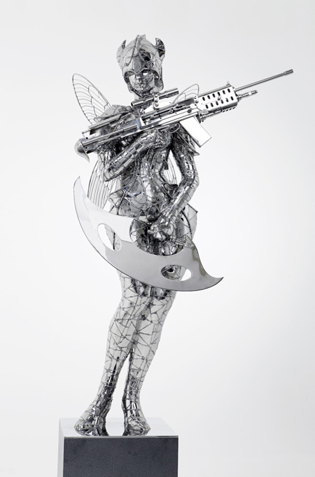 韓國藝術家So Hyun Woo最近在宋氏藝術空間(Song Eun Art Space)所展出的殘酷童話展3(Cruel Fairy Tales 3),以不鏽鋼重新塑造卡通人物的形象,包括小熊維尼、小豬、達菲鴨在內,背上長出了翅膀,手上拿著重兵器,瞄準的應該不是看慣可愛溫暖系卡通的小朋友們,而是最終兵器彼女的忠實粉絲吧!