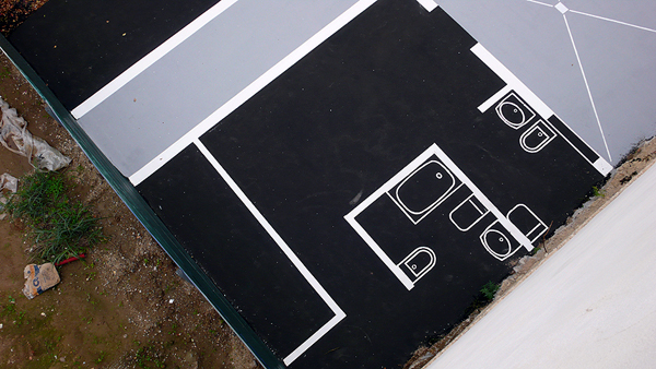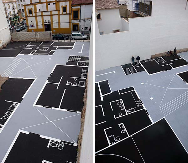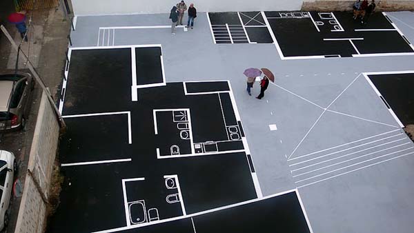 在西班牙就有一位設計師Maider Lopez發起了一個名為「The Intermedio」的計畫,將真實尺寸的建築藍圖不是劃在紙張上,而是直接劃在即將興建建築的空地上,上面的線條與室內設備就代表著未來的規劃,讓路過的人們也能了解這裡即將變成怎樣的都市面貌。