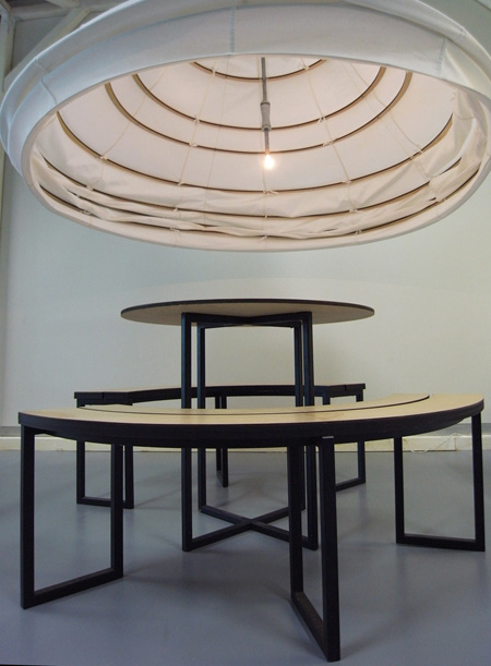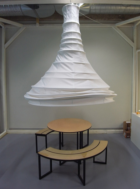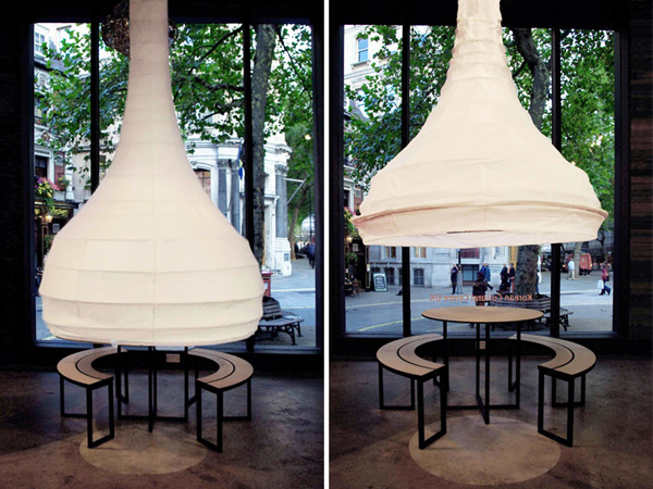 法國DuHO工作室設計師Olivia Decaris跟Hina Thibaud把Google+的好友圈圈的概念,化成了實體的家具設計,創造出一盞前所未有的概念燈,叫做「社交罩燈Social Drop」,這盞看起來像是蟬繭般的吊燈,可以同時讓兩位以上的使用者在「圈圈」裡,利用家具的結構拉近人與人之間的距離。