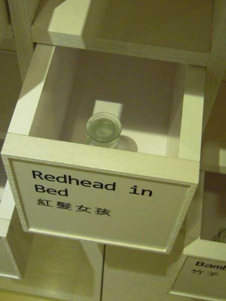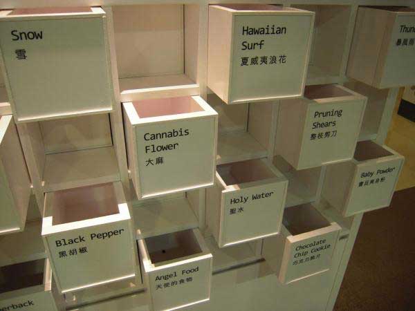 走進一看,店面簡約的裝潢,擺放著許多白色方格小抽屜的木頭櫃,就像學校的圖書館內,也擺放著供人查找書籍卡片的方格櫃,但是在「氣味圖書館」卻找不到任何一本書,反而,在每一個小抽屜內擺放著一個小玻璃瓶,抽屜外面寫著味道名稱,例如,西瓜棒棒糖、鏽味、竹子、紅髮女孩…等,每個味道名稱看起來跟一般對香水的印象不一樣,反而顯得新奇、有趣,更帶點不可思議,疑惑著、也更想要一探究竟,「紅髮女孩」會是什麼味道?這裡的「鏽味」是不是跟我認知中的鋼鐵生鏽味道一樣?因此,在還沒打開玻璃瓶聞味道之前,各種形而上的、抽象的、不可思議的味道名稱,就已經開啟了人們的無限想像。
