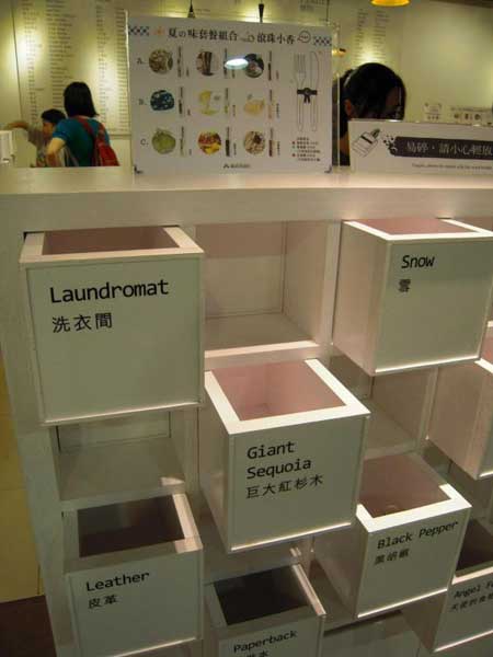 走在以販賣餐點為主、餐飲店林立的台北車站地下街(誠品站前店)路上,其中的一塊店招牌「氣味圖書館」,瞬間吸引了注目,疑惑著這是在賣餐點?還是在賣氣味?抑或只是間圖書館?