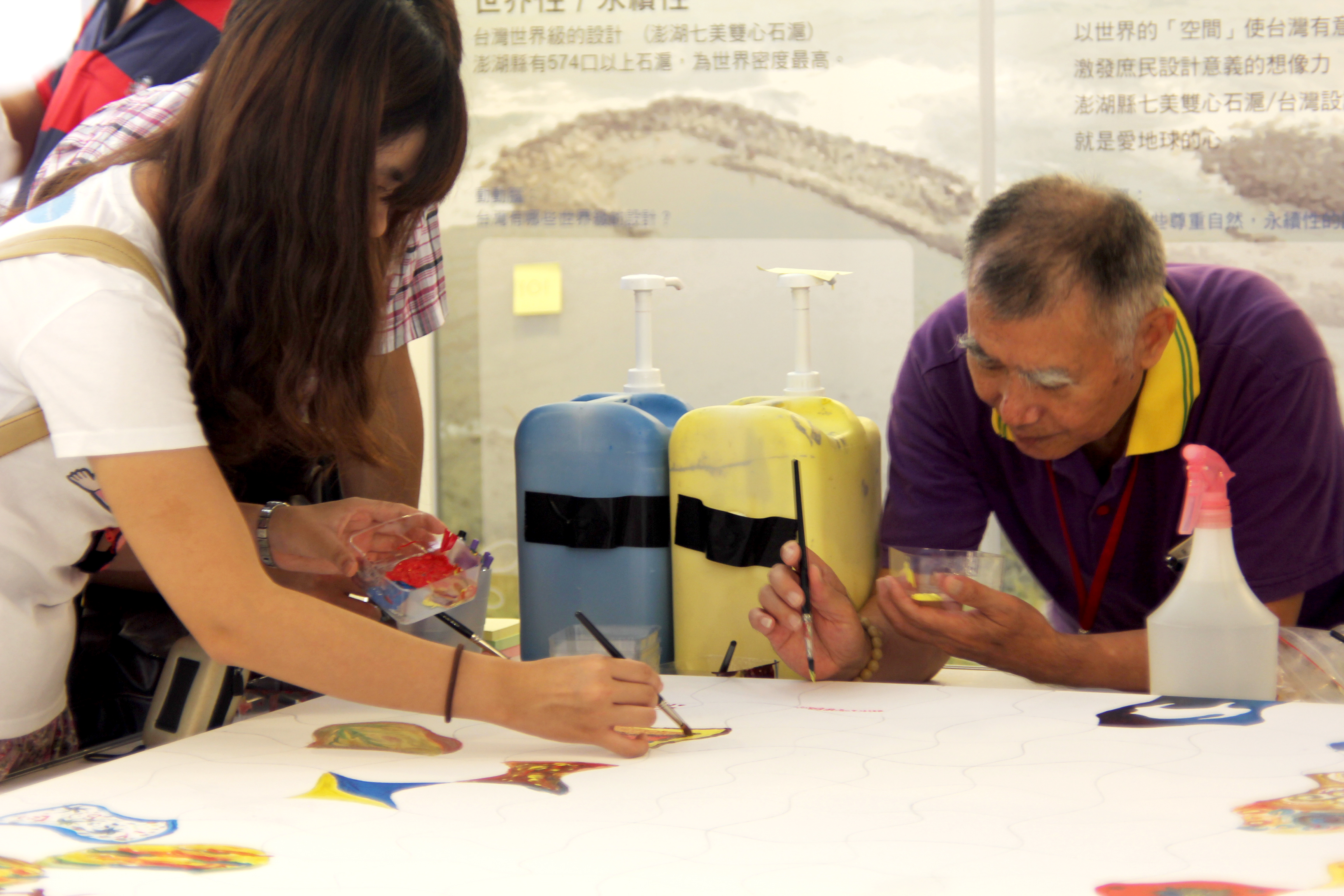 遠遠的看到空飄變形蟲再走到攤位,你會看到好大的畫布,就是它!上面已經不知道被顏料層層覆蓋長高了幾公分 XD,這裡就是攤位裡最核心的概念,也是設計協會用來跟看展的你作互動的場域,喊著「一筆一劃、設計生活化」的口號,希望你用變形蟲為主題在畫布上塗鴉,重點是,在這裡公然的塗抹顏料不用怕被抓、也不用回想國小、國中的時候美勞課的成績,畫就對啦!