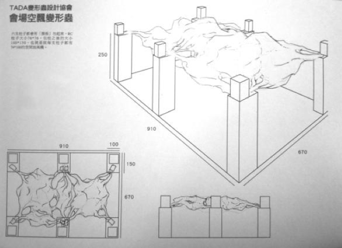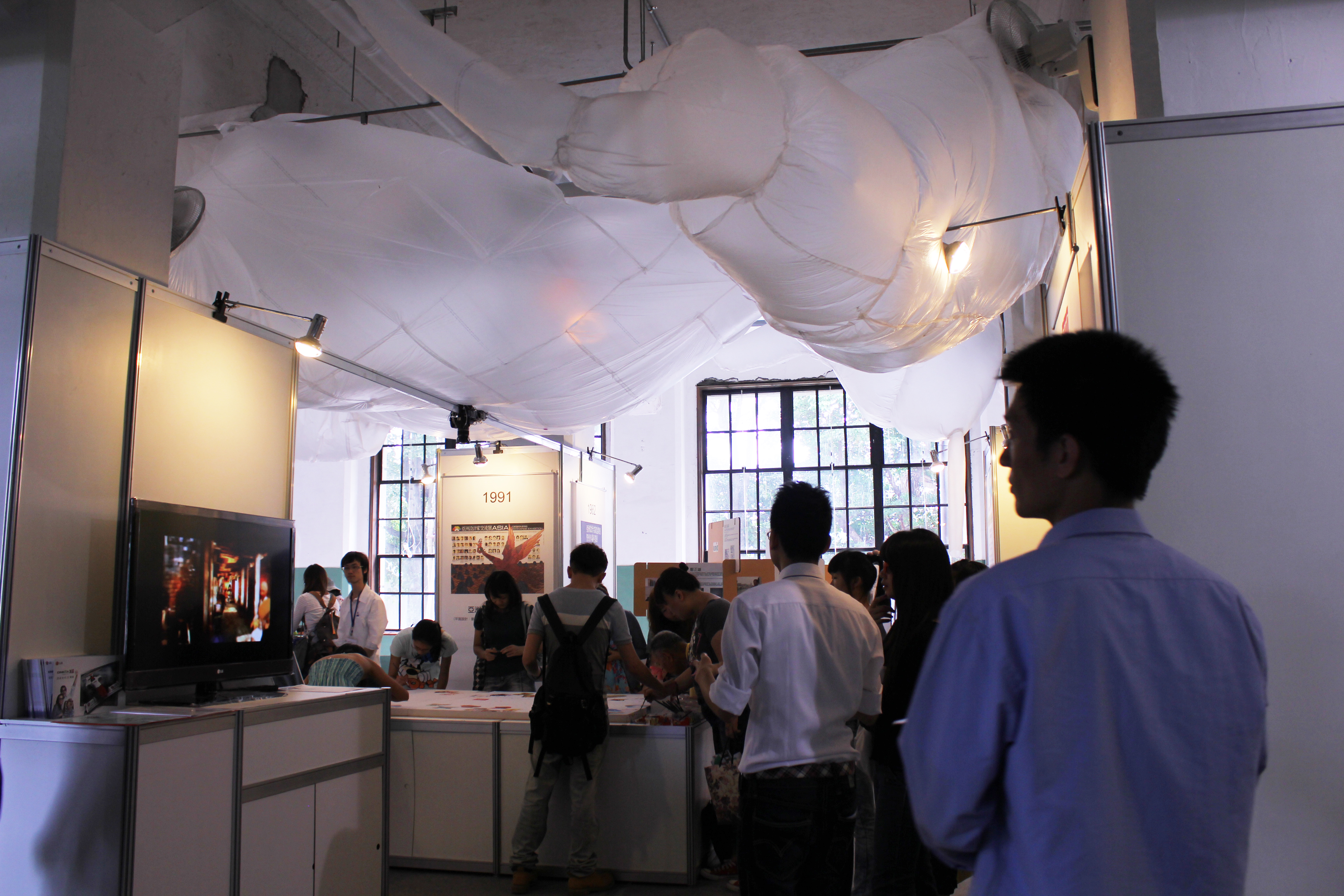 先來說說攤位的設計概念,從結構的方式就希望回歸簡單,讓大家把目光焦點放在軟體而不是硬體上,當大家習慣在佈展期間敲敲打打的用木工搭建美美的攤位,雋永R不動產則選擇使用「組合式展覽板」,這些展覽板除了外型很 潮(?) 簡潔之外也講求環保,構成攤位的每一個零件,都可以重複使用。白色的展覽板上,掛著同樣可以重複使用的寫真布,上面細數著變形蟲設計協會40多年來的歷史與精神內涵。耳邊呼呼吹的風切聲不是這裡開冷氣那裡忘了關窗戶,因為你一抬頭就會看到由藝術家江尚峯所設計、隨著六具電風扇搖擺生姿的變形蟲,用變動的外型呼應變形蟲的概念。