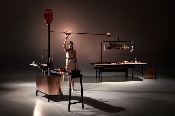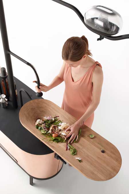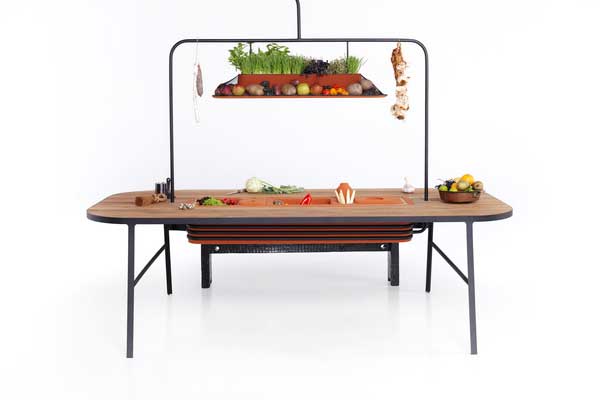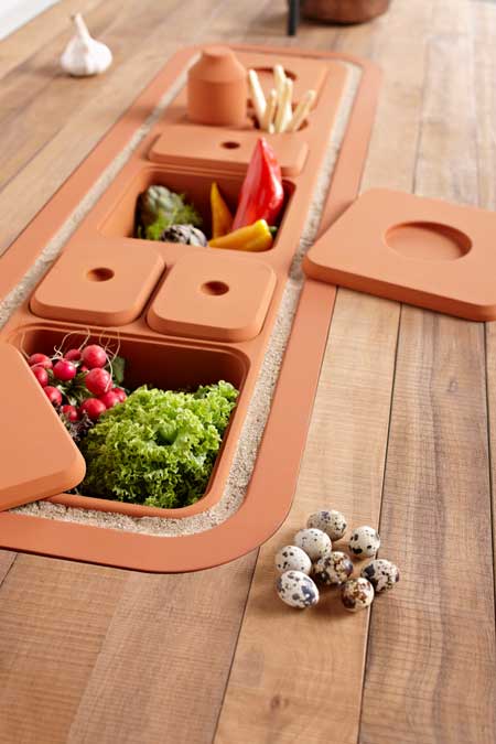 一般人儲藏食物第一個想到的就是冰箱,但在Microbial Home中,蒸氣式冷藏箱和蔬果儲藏系統強調用「最天然」的方式保存食物的元氣(所以咱們冰在冰箱裡的食物都掛了嗎?),每一格格子針對不同食物保持在各種最適溫度,桌子上方則開闢一片小花園,蔬果直接栽種在這邊,熟成時可以直接採來吃,也算是種得開心,吃得安心。