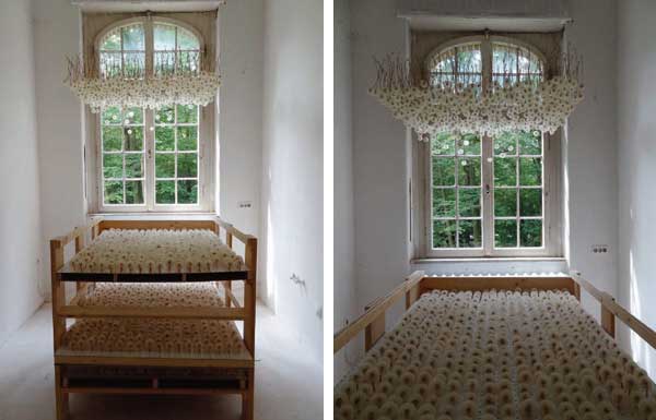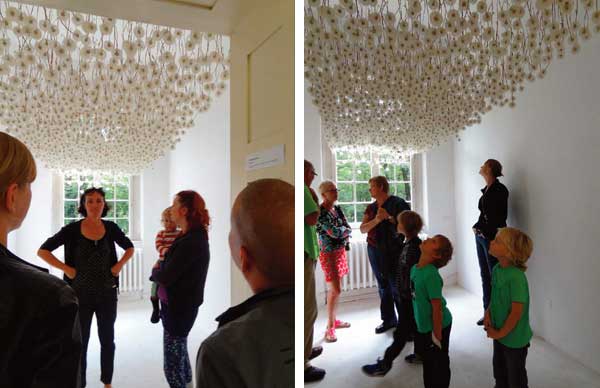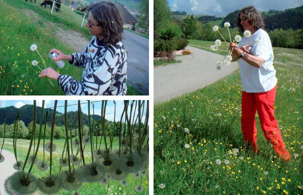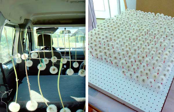 這麼浪漫的場景,製作過程可能沒那麼浪漫,Ramseier先用膠著劑固定住整朵蒲公英,一朵一朵插在特製的板子上,運送到展覽室後,才再一朵一朵倒掛起來,要收集到兩千朵蒲公英,工程浩大不在話下,而且蒲公英的種子經過膠水固定住後,喪失了自由飛翔的能力,聽了難免讓人心中小小糾結幾下。