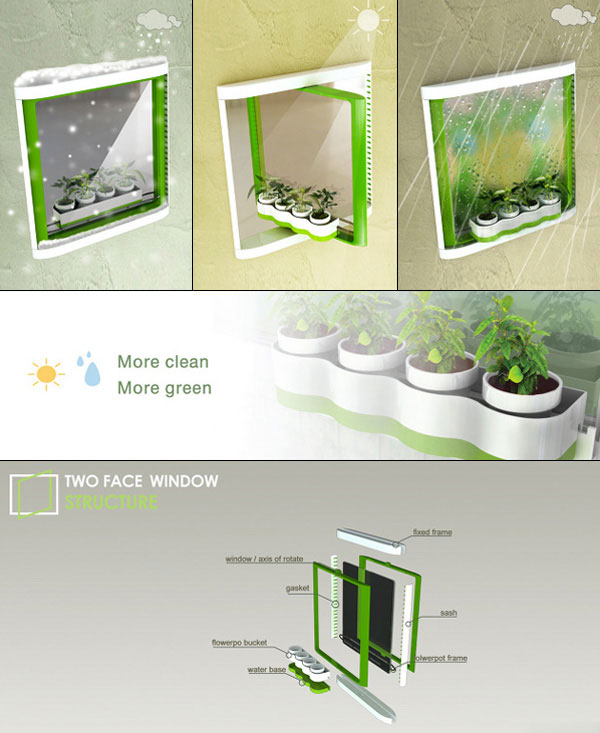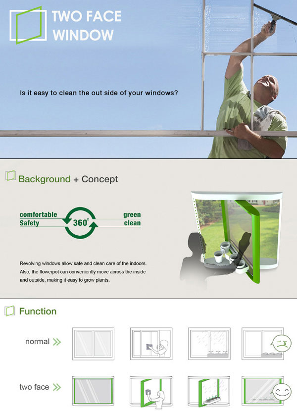 有鑑於此,這扇由設計師Junkyung Kim與Yonggu Do設計的概念雙面窗,利用360度轉軸的設計,讓擦窗戶這件事情變得很簡單,轉過來之後要擦窗就很容易,並且在窗框上設計了植物架,要整理植物也是輕鬆寫意,對於愛植物、愛清潔的朋友來說,真的是一舉兩得的簡單設計呢!