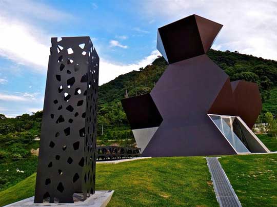 伊東豊雄建築博物館是由4種多面體以結晶體結構,所連結構成的鋼鐵混凝土混合建築,建築由入口大廳、3個展示空間及演講室等5個獨立空間所構成,各個房間都用不同的材料來裝飾,透過不同的展示方法,讓參觀者欣賞到不同面相的空間展示。