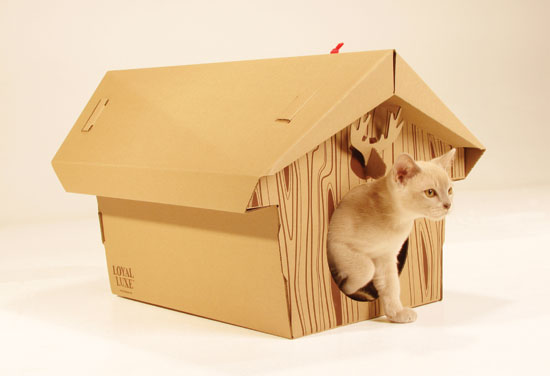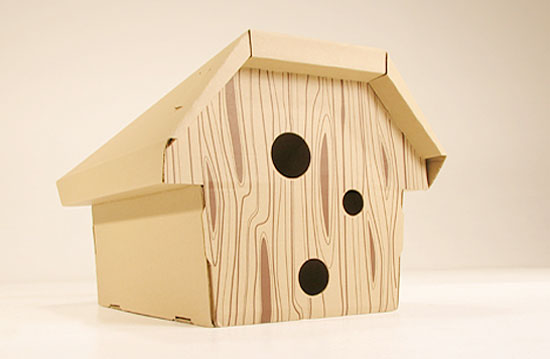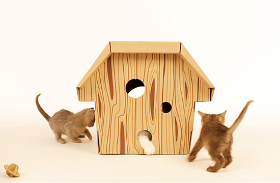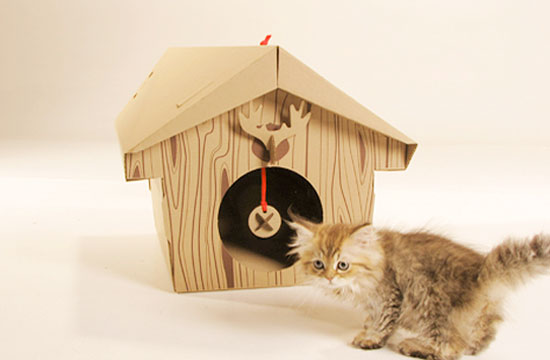 上面這款貓咪小木屋是以幽默的小鳥樹屋做發想,上頭該有的洞和晃來晃去的小玩具都有,當然,這屋子不只給貓咪住很好,給你的兔子或是雪貂,小狗也都很適合!(雖然是小鳥樹屋,但是千萬不要拿來養鳥阿...)環保的素材加上設計卡榫,再製作上不需要用到任何的膠水和或是工具,堅固度當然也不用擔心。