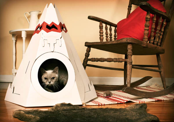 另外一款「貓帳篷」讓你的貓做印地安頭目吧,貓在家裡總是有著老大之姿,你可以在帳篷上面隨著貓的心情(或是你自己的心情),換上公牛的旗幟,戰斧,羽毛或是老鷹的裝飾物,貓帳篷完全由紙箱製作,貓咪對紙板的愛早就存在基因中,你一點也不需要擔心買來的窩他會不愛,你只需要擔心你的貓會不會因為太胖鑽不進去!