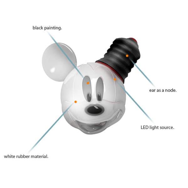 這款米老鼠造型燈泡,是由設計師Hong-kue Lee設計,外型超討喜,其實結構也很簡單,燈泡主體就是米奇的鼠臉,兩邊各有一隻大耳朵,左耳是燈泡底座,右耳則是米奇的白耳朵,除了 獐頭 鼠目、鼠鼻跟鼠嘴的部份之外,燈泡主體都是以白色橡膠材質包覆,當通了電之後,就會綻放出LED光芒,不管是男女老少看了都想帶回家啊!